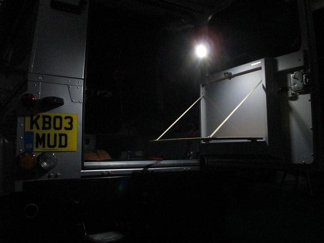 The flexible stalk allows you to aim the light exactly where you need it. The Labcraft LED Map Light is pictured here fitted to the drop-down table on the MUD Pop-Top Defender Camper.