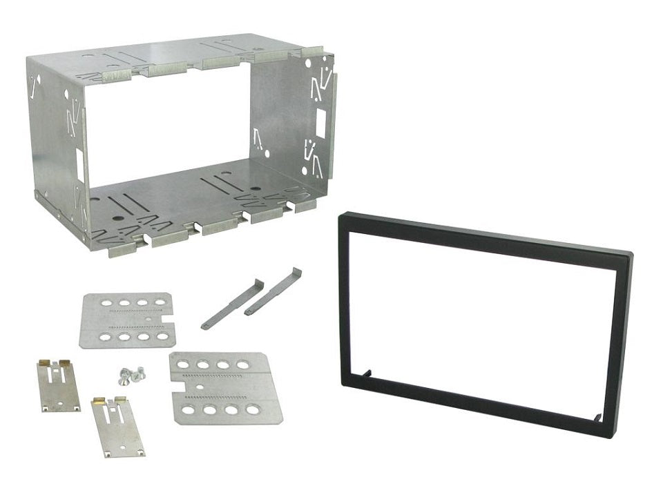 The Double DIN Mounting kit contains a pair of spring clips and a pair of flat plates in addition to the traditional mounting ‘cage’ and outer trim bezel for the fascia.