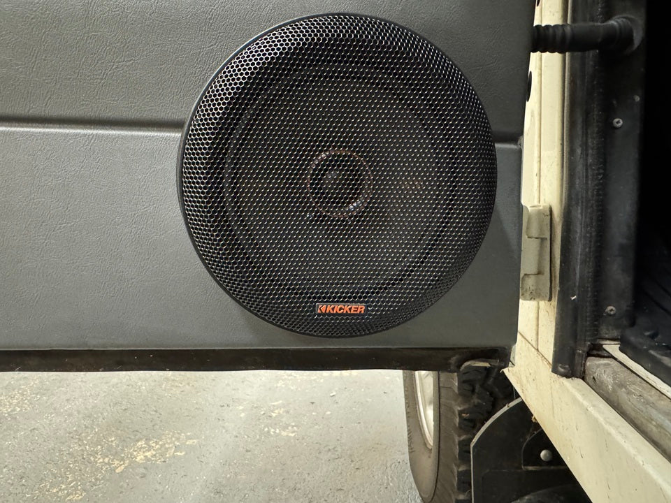 The original NAS/50th speakers used a 123mm diameter cut-out. Some 6.5in speakers have a larger diameter cone that will not fit within the central hole of the NAS/50th doors speaker plinths. MUD offers a couple of 6.5in KICKER Audio speaker options that drop straight into the Genuine Land Rover NAS/50th door speaker plinths. Both the KICKER CS and KICKER KS (pictured) speakers provide a great off-the-shelf upgrade for any NAS/50th Defender owner looking to replace their tired speakers.
