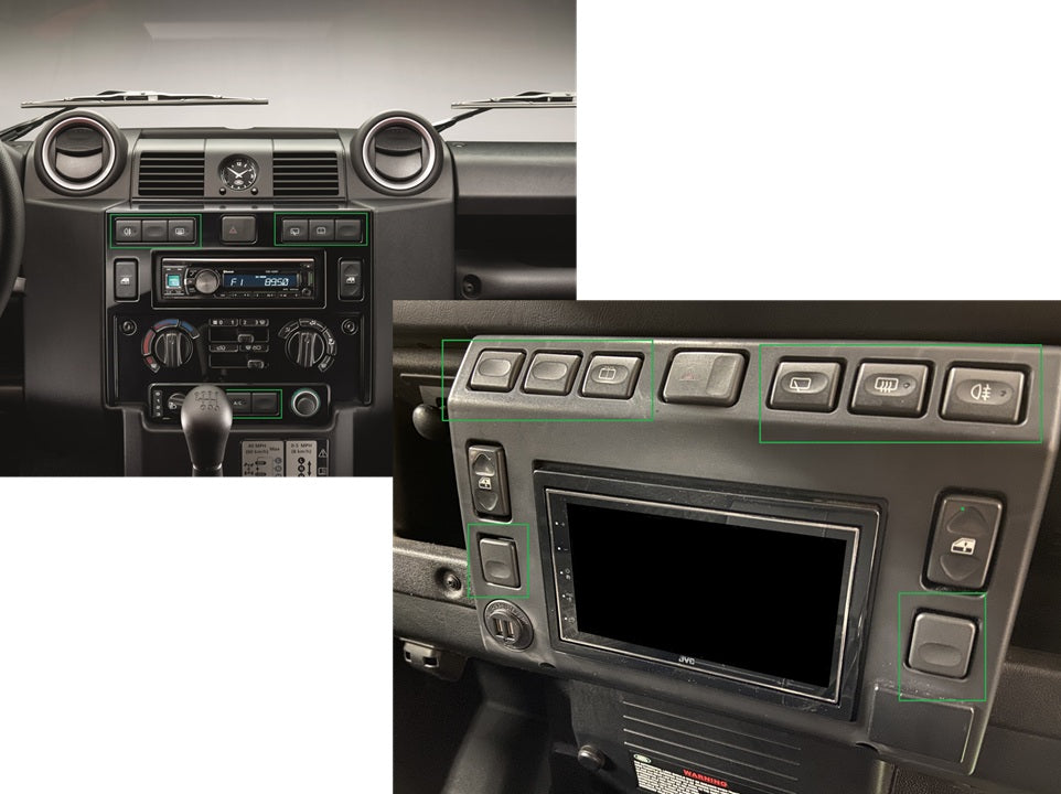 The electric window switch fits the rectangular holes either side of the media console/radio in both the Td5 and Tdci Defender dashboard.